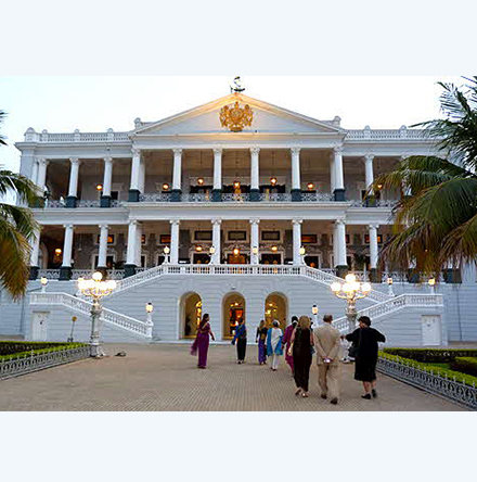 The palace is spread out in a scorpion shape with two pincers spread out as wings on the north. The middle part occupies the main building. The Harem quarters and the kitchen stretch towards the south. The palace was designed by an Italian architect in western style, and took 9 years for construction, and is completely built with Italian Marble. The foundation stone was laid on 3rd March 1884. Falaknuma houses a collection of rare treasures collected by the Nizam including paintings, furniture and statues. The Jade collection of the Palace is unique in the world. The palace also has a library containing most valuable collection of books and manuscripts. The Palace also has the distinction of having a 100-seat dining table. The Palace is now converted into a heritage hotel by the Taj Hotels group.